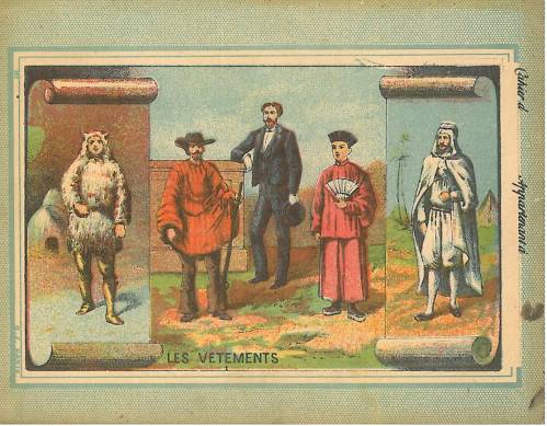 Couverture non numérotée : Les vêtements. Chromolithographie sur papier épais beige. Fond blu-vert. Au dos, texte explicatif anonyme, en deux colonnes.