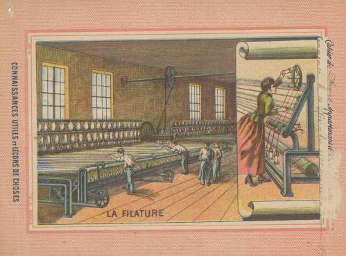 Couverture non numérotée : La filature. Chromolithographie sur papier épais beige. Fond rose… cahier de devoirs. Au dos, texte explicatif anonyme, en deux colonnes.