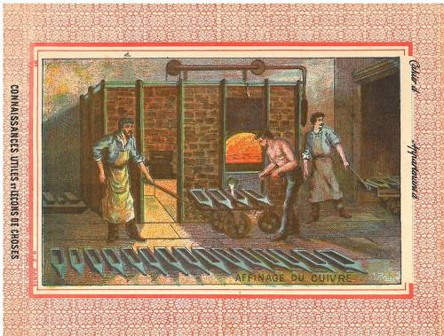 Couverture non numérotée : Affinage du cuivre. Chromolithographie sur papier épais beige. Fond rose. Au dos, texte explicatif anonyme, en deux colonnes.