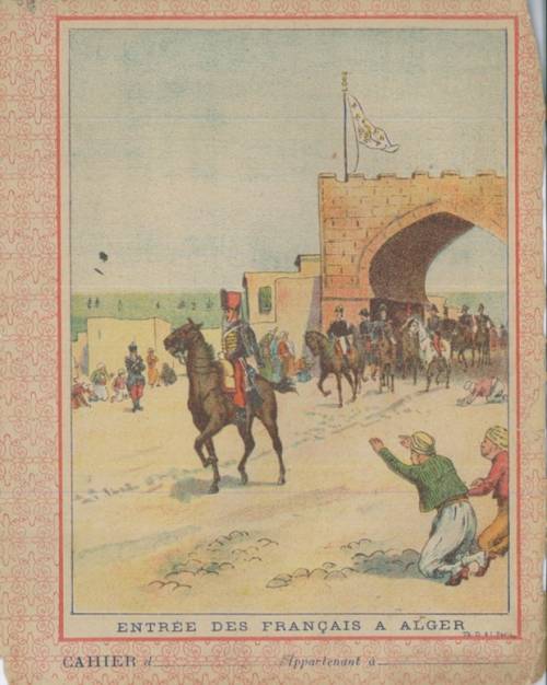 Couverture non numérotée : entrée des Français à Alger. Chromolithographie sur papier épais beige. Fond rose. Au dos, texte explicatif anonyme.