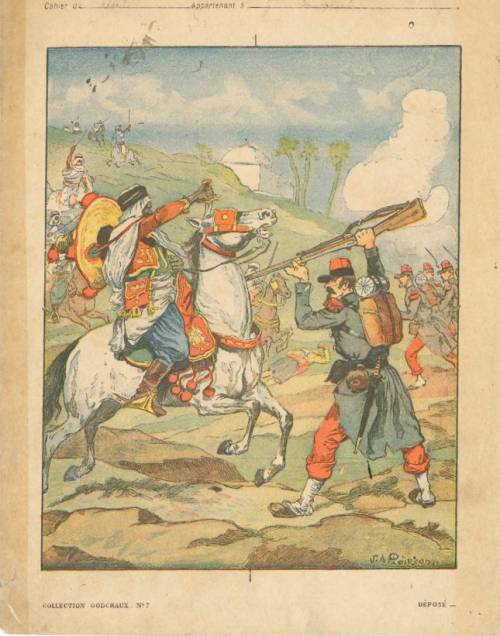Couverture non numérotée : Bataille d’Isly en 1843. Chromolithographie sur papier épais beige… cahier de brouillon appartenant à Paul (illisible). Au dos, texte explicatif anonyme.