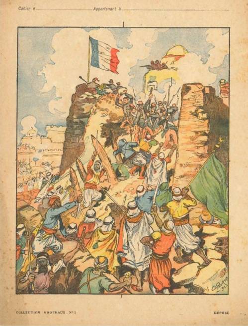 Couverture non numérotée : Défense héroïque de Mazagran en 1840 ; Chromolithographie sur papier épais beige. Au dos, texte explicatif anonyme.