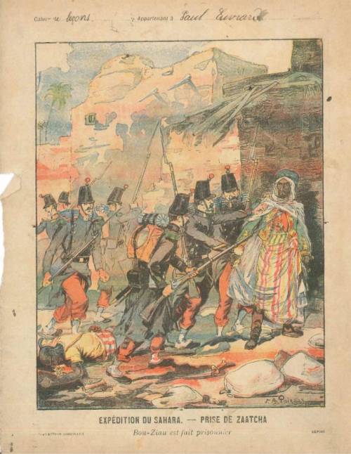 Couverture non numérotée : Expédition du Sahara / Prise de Zaatcha. Chromolithographie sur papier épais beige… cahier de leçons appartenant à Paul (illisible). Au dos, texte explicatif anonyme.