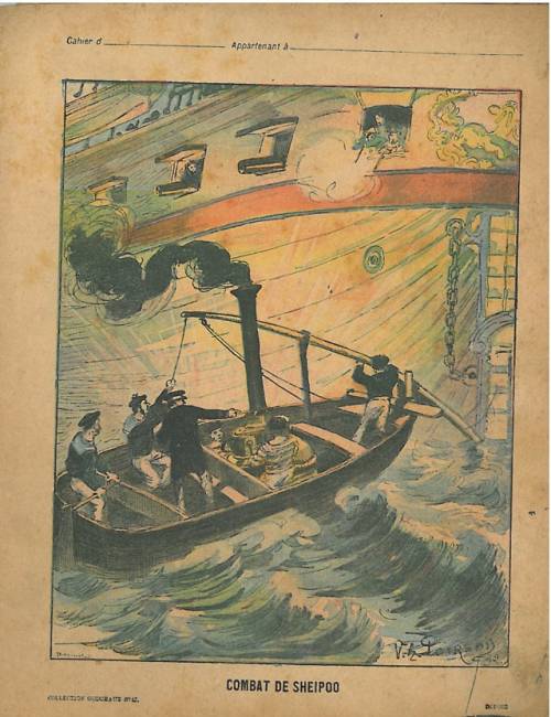 Couverture non numérotée : Combat de Shei-Poo. Chromolithographie sur papier beige épais… cahier de devoir appartenant à Jean (illisible).Au dos, texte explicatif anonyme