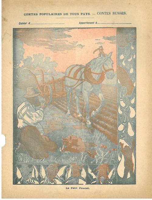 Couverture non numérotée : Le petit poucet. Chromolithographie sur papier épais beige. Au dos, texte du conte (traduction de Léon Goldschmann).