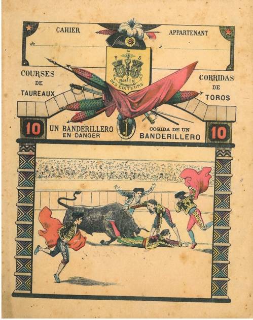 Couverture n°10 : Banderilliro en danger/ Cogida de un banderilliro. Chromolithographie sur papier épais. Frise avec banderilles et cape. Au dos, sous une gravure en n/b d’un taureau, texte explicatif anonyme en 2 colonnes (2 langues), avec gravures