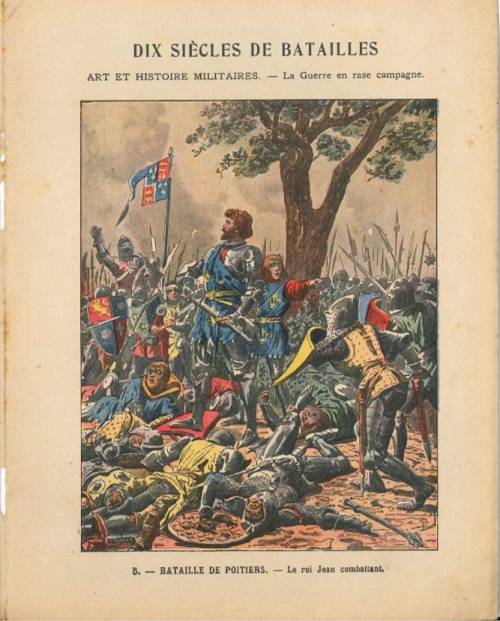Couverture n° 5 : Bataille de Poitiers / Le roi Jean combattant (1356). Chromolithographie sur papier épais. En pages intérieures et au dos, texte explicatif signé Capitaine Fanfare.