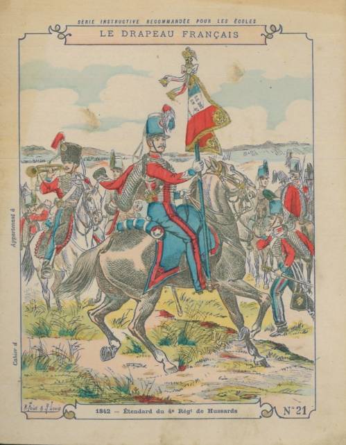 Couverture n°21 : Etendard du 4ème régiment des hussards. Chromolithographie sur papier beige épais. Au dos, texte avec, souvent, des croquis.