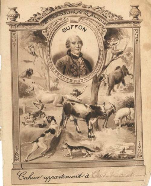 Couverture non numérotée : Buffon. Chromolithographie sur papier épais beige. Portrait en médaillon et une gravure sur le mode animal (animaux domestiques et sauvages)… cahier appartenant à Claude (illisible). Au dos, courte biographie (auteur anonyme).