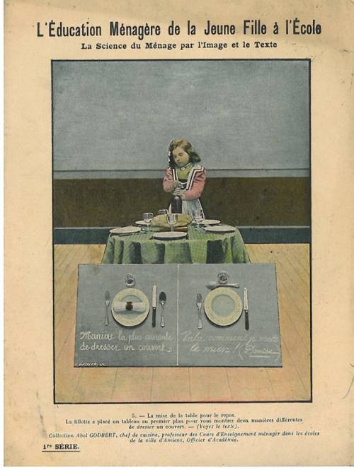 Cette série, au titre complet L’Education ménagère de la jeune fille à l’école, et dont le sous-titre est La science du ménage par l’image et le texte, est numérotée et incomplète dans la collection. C’est une production des papeteries vosgiennes des Châtelles. Son directeur, Louis Geisler (1852-1014) reprend l’usine familiale de pâte à papier en 1881. Illustrateur, inventeur de la trichromophotogravure et d’une machine de fabrication de cahier, il développe l’entreprise et ouvre une succursale à Paris Il y crée un atelier de photographie et de phototypie qui attire les affichistes et les directeurs de presse. Illustrateur inconnu.