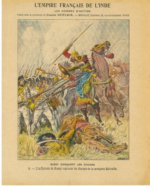 Couverture N° 6 : Bussy conquiert les Circars. Chromolithographie sur papier épais beige. Texte explicatif anonyme en 2ème, 3ème et 4ème (dos) de couverture.
