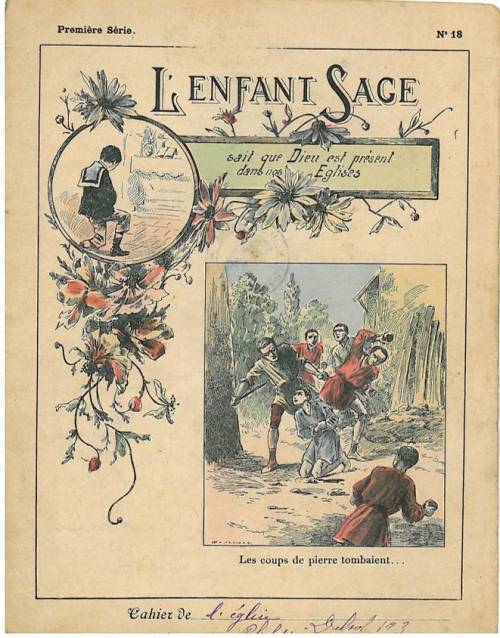 Couverture n 18 : L’enfant sage sait que Dieu est présent dans nos églises. Chromolithographie sur papier beige épais. Médaillon illustratif, frise fleurie et gravure annonçant l’histoire au dos. Au dos, texte intitulé Tharsinacus et signé L’Ermite.