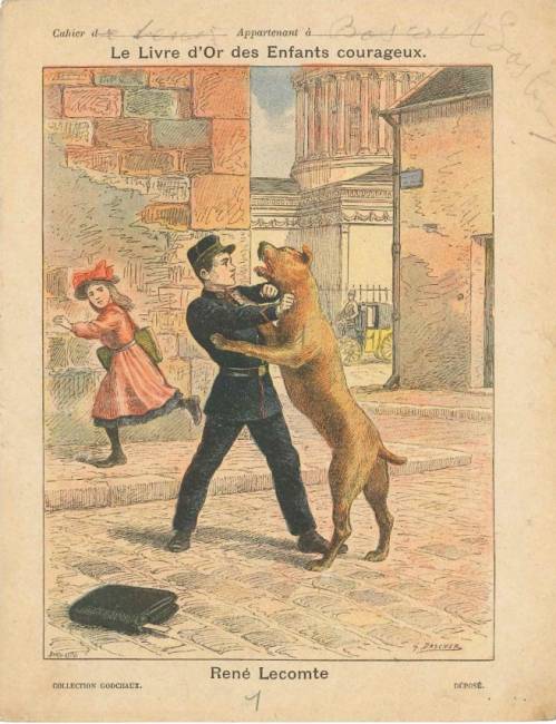 Couverture non numérotée : Henri Lecomte. Chromolithographie sur papier épais beige. Au dos, texte anonyme explicatif sur l’acte de bravoure et conclusion morale.