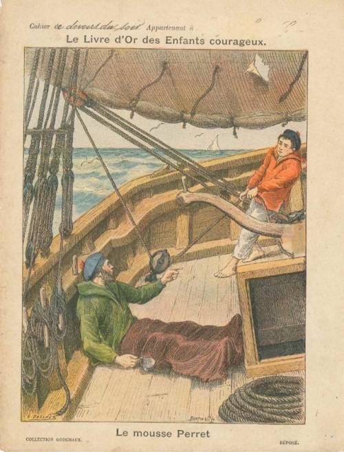 Couverture non numérotée : le mousse Perret. Chromolithographie sur papier épais beige…cahier de devoirs du soir. Au dos, texte anonyme explicatif sur l’acte de bravoure et conclusion morale.