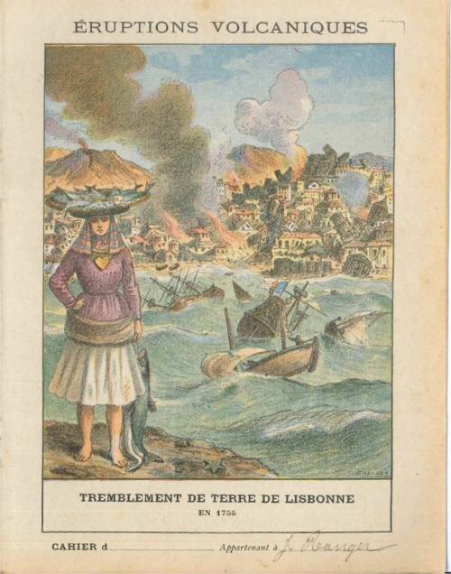 Couverture non numérotée : Tremblement de terre de Lisbonne en 1755. Chromolithographie sur papier beige épais…cahier appartenant à J. Ranger. Au dos, texte simple et anonyme, dans un fin cadre noir.