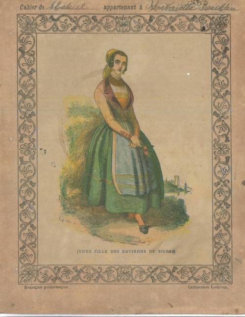 Couverture non numéroté : Jeune fille près de Bilbao. Chromolithographie sur papier épais… cahier de calcul appartenant à Henriette illisible). Au dos, texte anonyme explicatif.