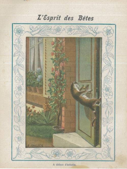 Couverture non numérotée : A défaut d’échelle (le chat). Chromolithographie avec frise bleue style Art déco, sur papier épais beige. Au dos, une notice zoologique, signée Er.Richa, l’anagramme de Charier, et, en bas, une table de multiplication.