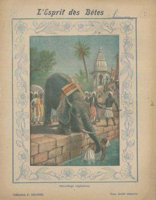 Couverture non numérotée : Sauvetage ingénieux (l’éléphant). Chromolithographie avec frise bleue style Art déco, sur papier épais beige. Au dos, une notice zoologique, signée Er.Richa, l’anagramme de Charier, et, en bas, une table de multiplication.