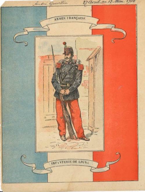 Couverture non numérotée : France (Infanterie de ligne). Chromolithographie sur papier épais beige. Au dos, texte explicatif anonyme.