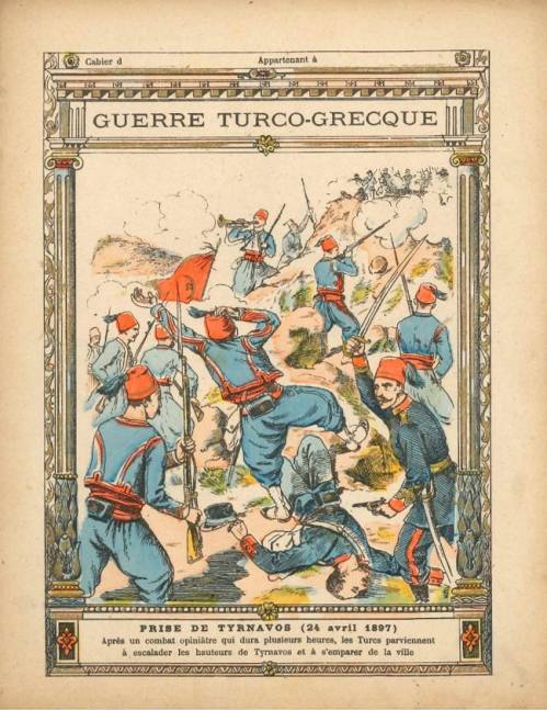 Couverture n° 12 : Guerre turco-grecque / Prise de Tyrnavos (24 avril 1897): Chromolithographie sur papier épais beige. Au dos, texte explicatif anonyme.