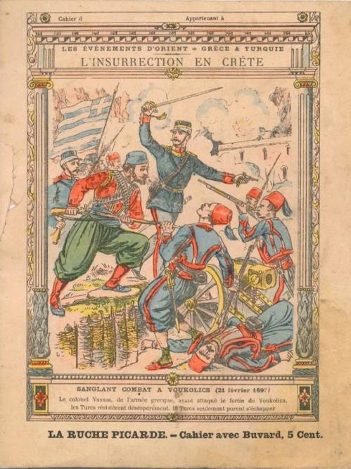 Couverture n°5 : L’insurrection en Crète / Sanglant combat à Voukoulics (21 février 1897). Chromolithographie sur papier épais beige. Au dos, texte explicatif anonyme.
