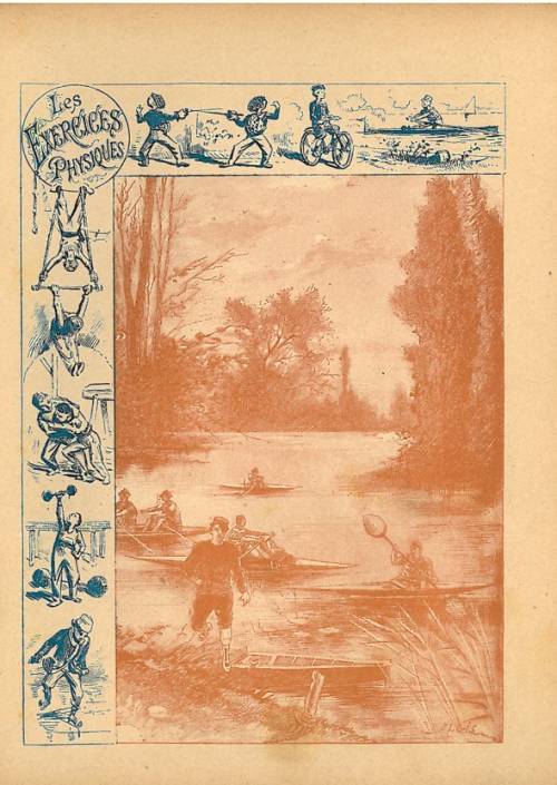Couverture non numérotée : Le canotage. Chromolithographie sur papier épais beige. Bichromie. Frise représentant les principaux sports évoqués dans la série. Au dos, texte explicatif signé Er. Richa, l’anagramme de l’éditeur.
