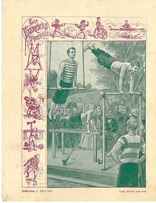 Couverture non numérotée : La gymnastique. Chromolithographie sur papier épais beige. Bichromie. Frise représentant les principaux sports évoqués dans la série. Au dos, texte explicatif signé Er. Richa, l’anagramme de l’éditeur.