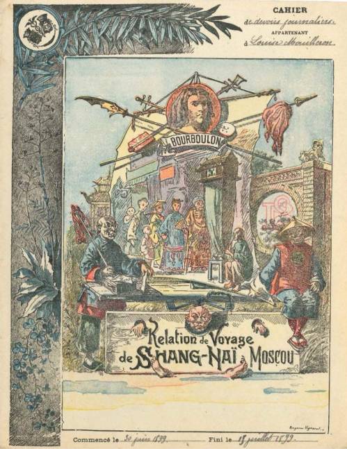 Couverture non numérotée :.De Bourboulon / Relations de voyage de Shang-Haï à Moscou. Chromolithographie sur papier épais beige. Frise feuillue, portrait en médaillon et gravure… cahier dedevoirs journaliers appartenant à Louise Mouilleron. Au dos, texte explicatif anonyme.
