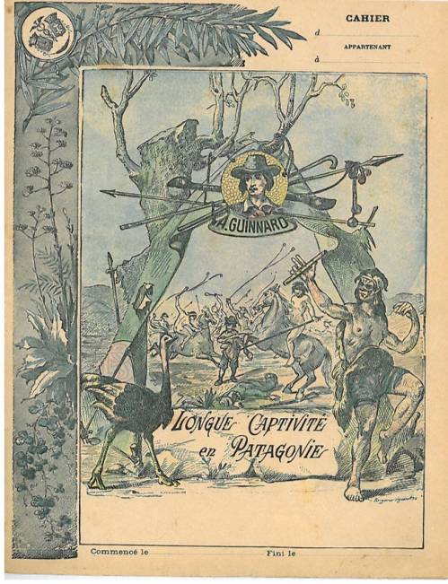 Couverture non numérotée : A. Guinnard / Longue captivité en Patagonie. Chromolithographie sur papier épais beige. Frise feuillue, portrait en médaillon et gravure. Au dos, texte explicatif anonyme.