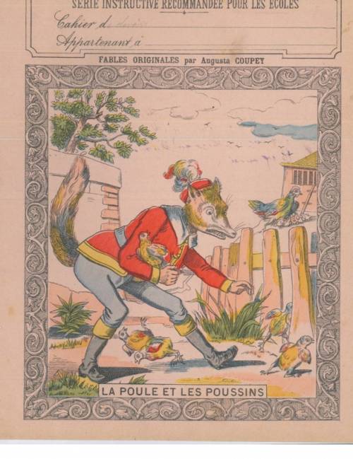 Couverture non numérotée : La poule et les poussins. Chromolithographie sur papier beige épais. Au dos, texte de la fable;