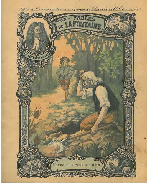 Couverture non numérotée : L’avare qui a perdu son trésor. Chromolithographie sur papier épais beige. Frise très élaborée avec 3 saynètes et le fabuliste en médaillon… cahier de composition appartenant à Edmond Lauriaux appartenant à Au dos, texte de la fable et reprise de la frise.