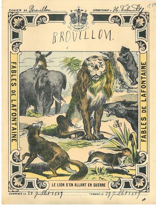 Couverture non numérotée : Le lion s’en allant ne guerre. Chromolithographie sur papier épais beige. Frise très élaborée… cahier appartenant à H. (illisible) Au dos, texte de la fable.
