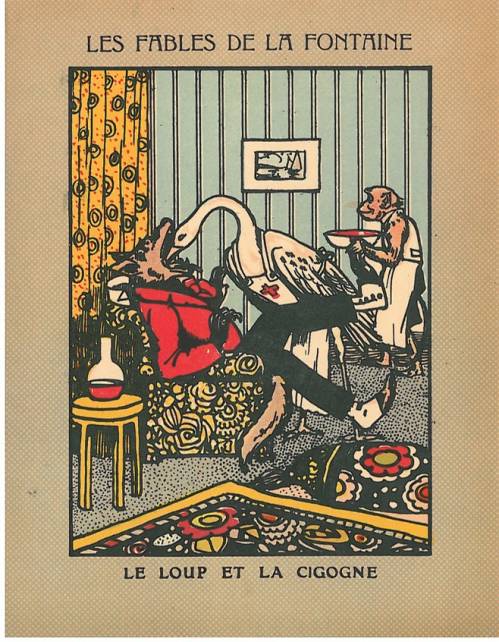 Couverture non numérotée : Le loup et la cigogne. Chromolithographie sur papier épais beige. Fond de couleur. Au dos, texte de la fable.