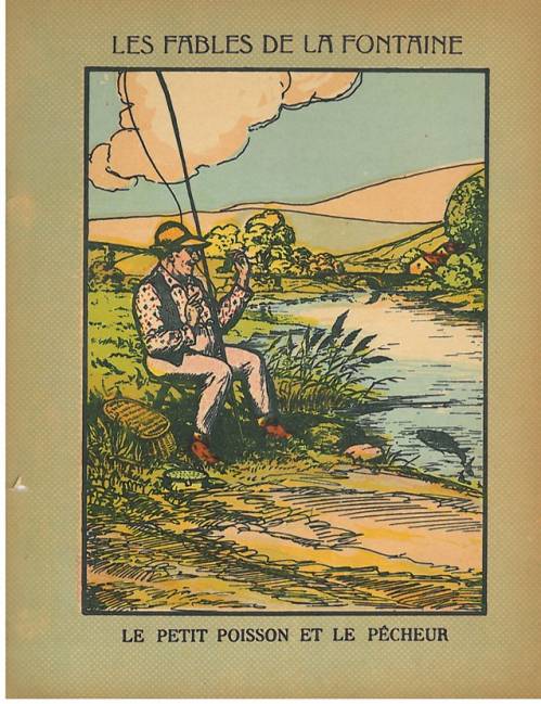 Couverture non numérotée : Le petit poisson et le pêcheur. Chromolithographie sur papier épais beige. Fond de couleur. Au dos, texte de la fable.