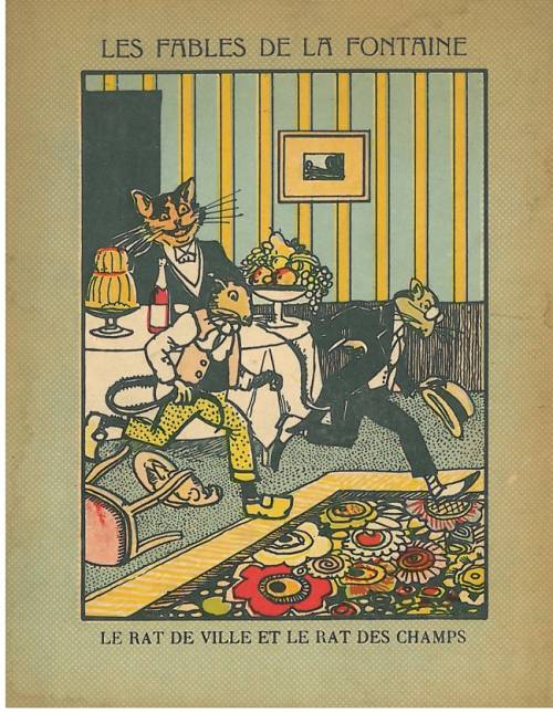 Couverture non numérotée : Le rat des villes et le rat des champs. Chromolithographie sur papier épais beige. Fond de couleur. Au dos, texte de la fable.