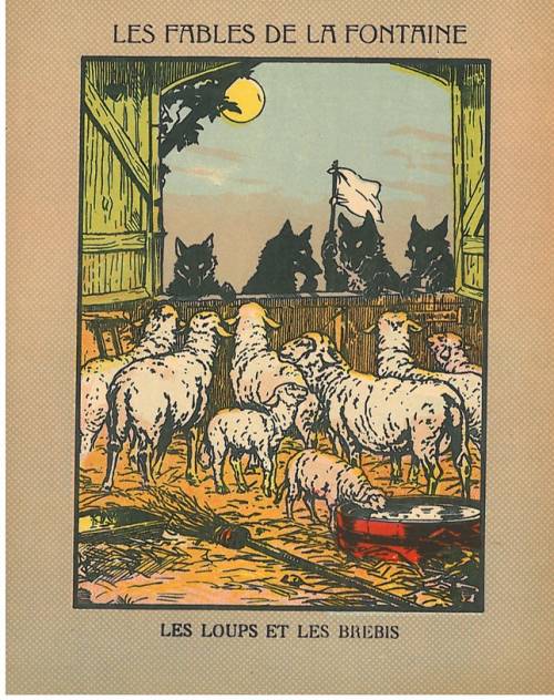 Couverture non numérotée : Le loup et les brebis. Chromolithographie sur papier épais beige. Fond de couleur. Au dos, texte de la fable.