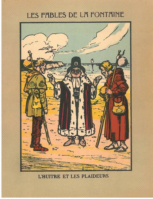 Couverture non numérotée : L’huître et les plaideurs. Chromolithographie sur papier épais beige. Fond de couleur. Au dos, texte de la fable.