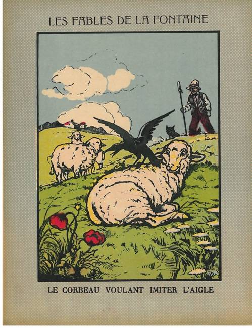 Couverture non numérotée : Le corbeau voulant imiter l’aigle. Chromolithographie sur papier épais beige. Fond de couleur. Au dos, texte de la fable.