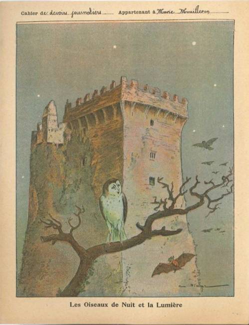 Couverture non numérotée : Les oiseaux de nuit. Chromolithographie sur papier épais beige… cahier de devoirs journaliers appartenant à Marie Mouilleron. Au dos, texte de la fable et gravure en n/b.