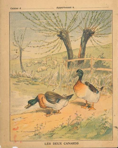Couverture non numérotée : Les deux canards. Chromolithographie sur papier épais beige, Au dos, texte de la fable et gravure en n/b.