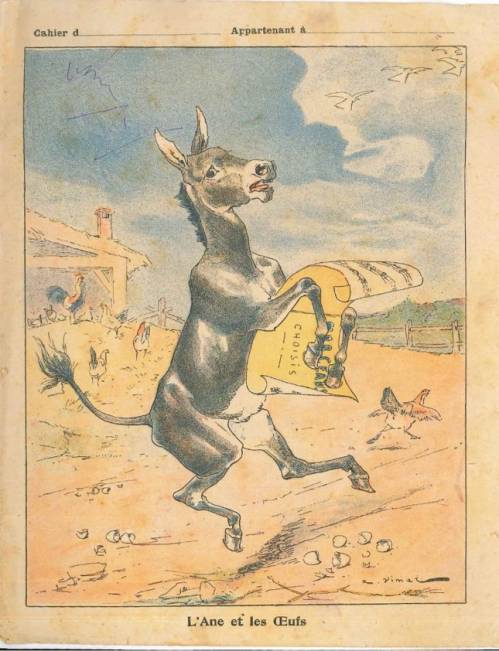 Couverture non numérotée : L’âne et les œufs. Chromolithographie sur papier épais beige, Au dos, texte de la fable et gravure en n/b.
