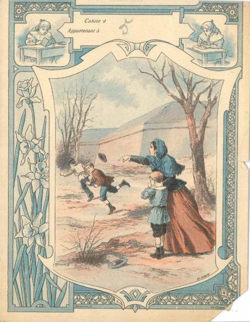 Couverture non numérotée : Madame Pape-Carpentier. Chromolithographie sur papier épais beige. Frise florale bleue avec figurines en haut. Au dos, texte explicatif signé Charavey.
