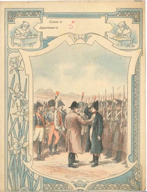 Couverture non numérotée : La cantinière Schellinck. Chromolithographie sur papier épais beige. Frise florale bleue avec figurines en haut. Au dos, texte explicatif signé Charavey.