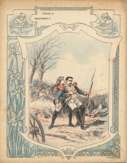Couverture non numérotée : Liberté Barreau. Chromolithographie sur papier épais beige. Frise florale bleue avec figurines en haut. Au dos, texte explicatif signé Charavey.