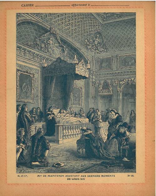 Couverture n°18 : Madame de Maintenon assistant aux derniers moments de Louis XIV. . Chromolithographie sur papier épais beige. Bichromie, sur fond marron. Au dos, texte explicatif anonyme.