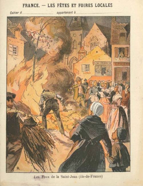 Couverture non numérotée : Les feux de la Saint-Jean (Ile-de-France). Chromolithographie sur papier épais beige. Au dos, texte explicatif signé Pierre Lelong.