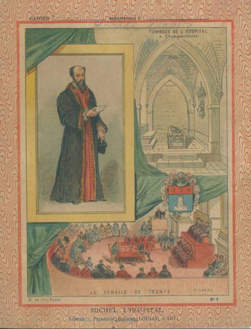 Couverture n° 1 : Michel de l’Hospital. Chromolithographie sur papier épais beige. Au dos, texte extrait de Les Français illustres, de madame Gustave Demoulin, édité par Hachette en 1893 (Bibliothèque des écoles et des familles, Hachette).