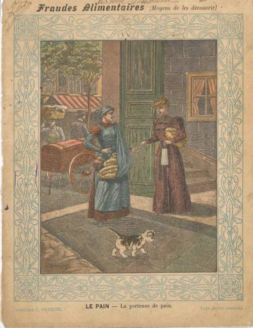 Couverture non numérotée : Le pain - La porteuse de pain. Chromolithographie sur papier épais beige. Frise bleue. Au dos, texte explicatif signé G. Margeot titré Moyens de découvrir les fraudes alimentaires.