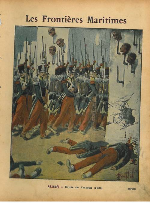 Couverture non numérotée : Entrée des Français à Alger en 1830 ;. Chromolithographie sur papier beige épais. En pages intérieures, texte explicatif anonyme. Au dos, cliché photographique : le cuirassé de 1er rang Le Redoutable..