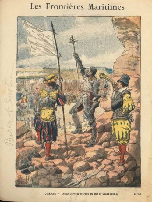 Couverture non numérotée : Le gouverneur de Calais se rend au duc de Guise en 1556. Chromolithographie sur papier beige épais. En pages intérieures, texte explicatif anonyme. Au dos, cliché photographique : le cuirassé Le Furieux..
